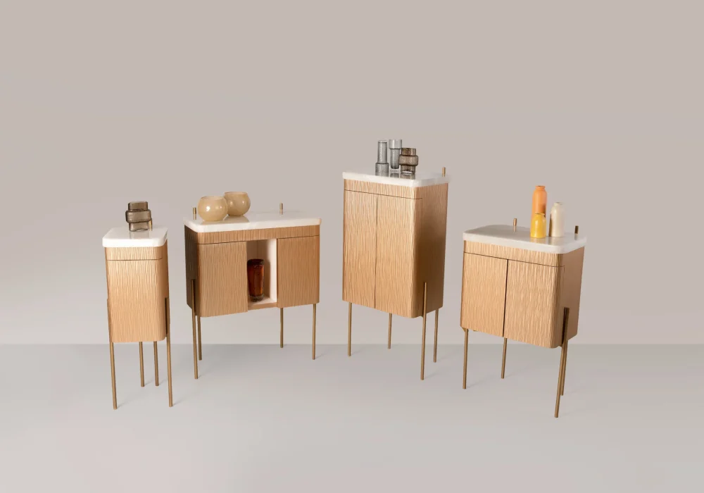 • Finishing: textured wood (Body and interior), onyx marble, and bronze metal legs.