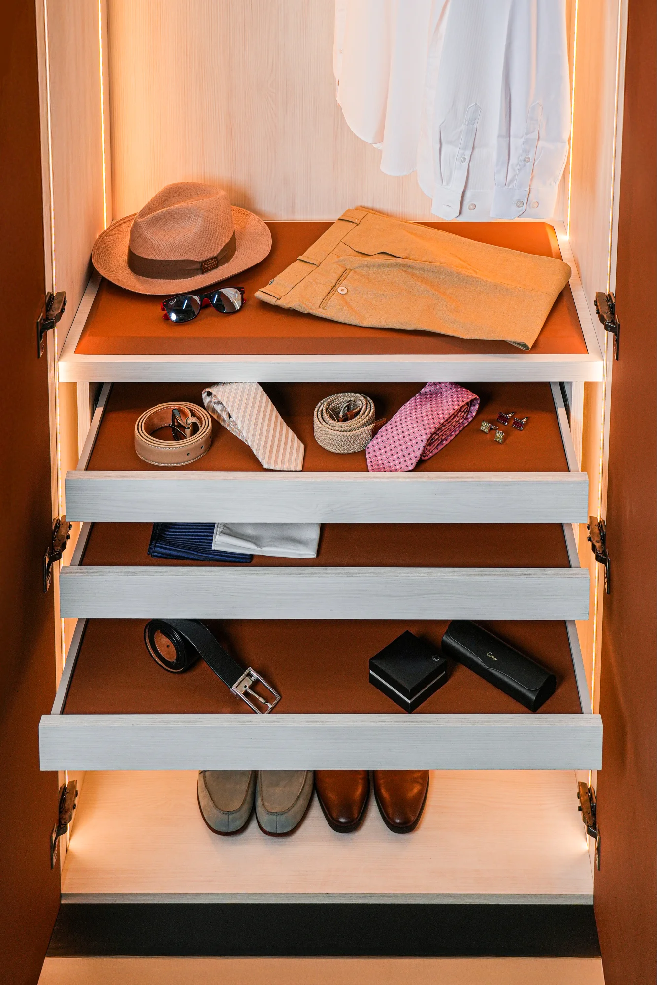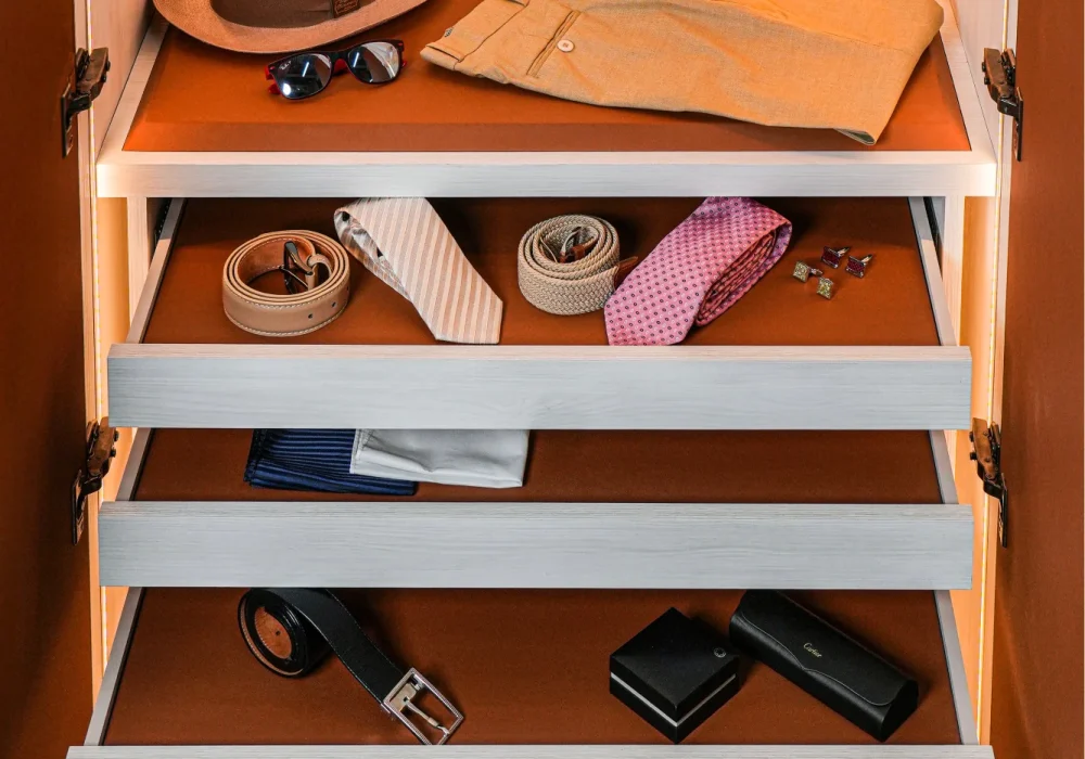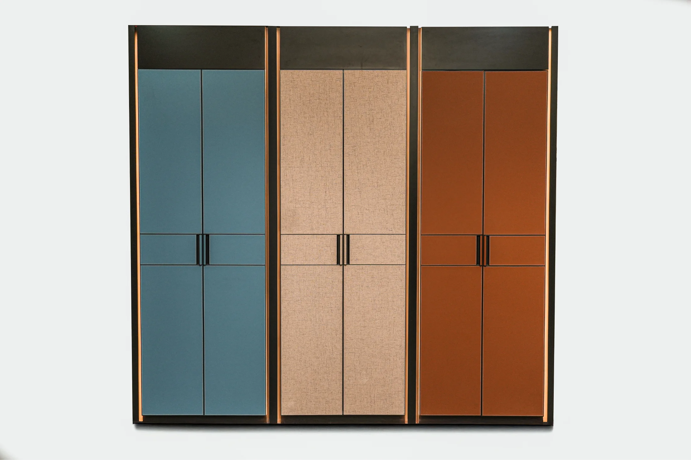 Wrapped in exquisite eco-leather finishes and adorned with legendary veneers, each wardrobe conceals thoughtfully designed drawers upholstered in fine leather, a perfect harmony of functionality and timeless style.