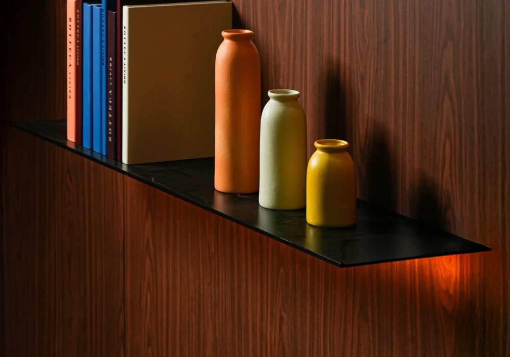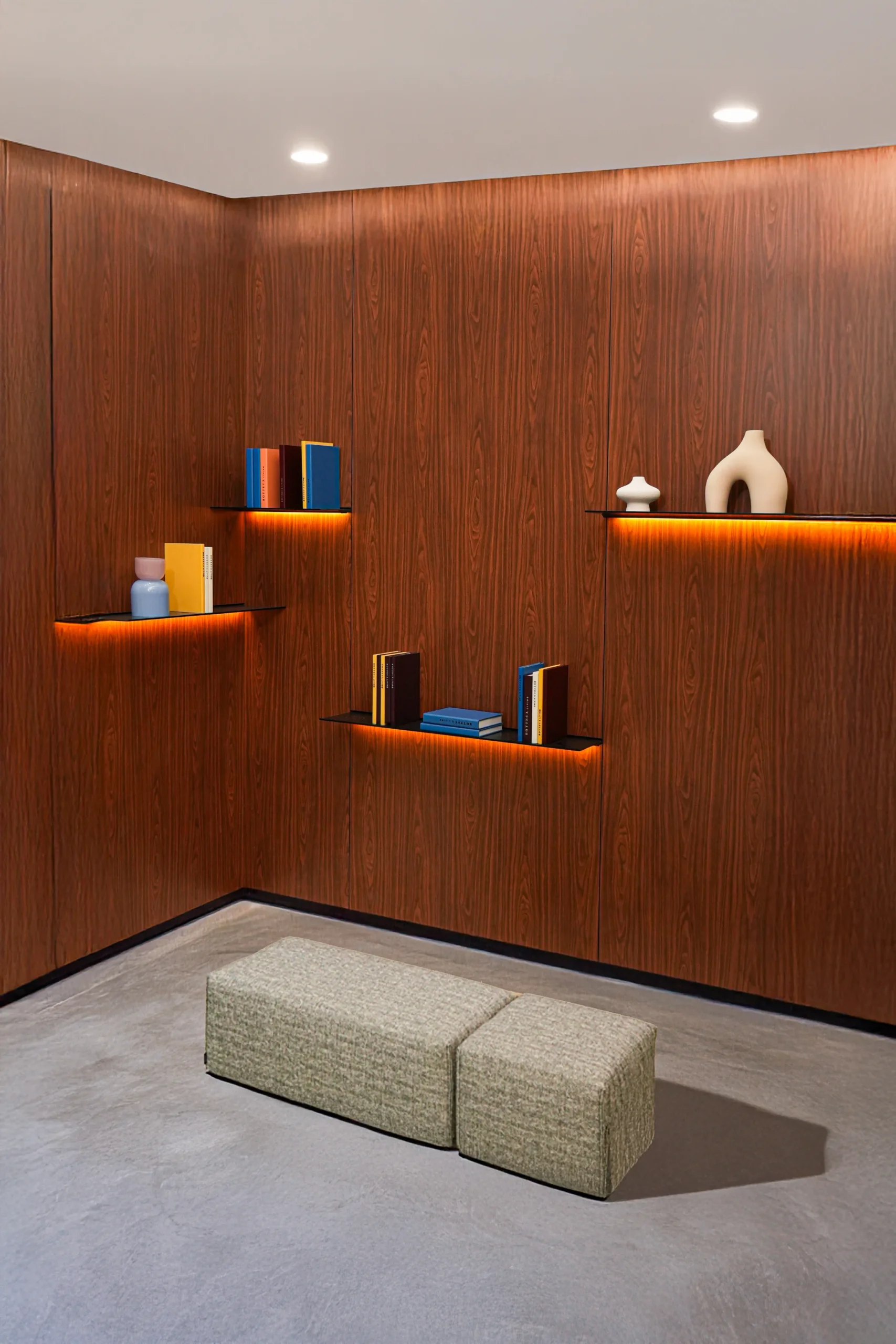 Tokyo from Bottega Living presents wall cladding adorned with softly illuminated shelves, creating an environment of boundless simplicity. Available in a curated selection of woods, fabrics, and textured panels, it transforms any space into a sanctuary of refined elegance.