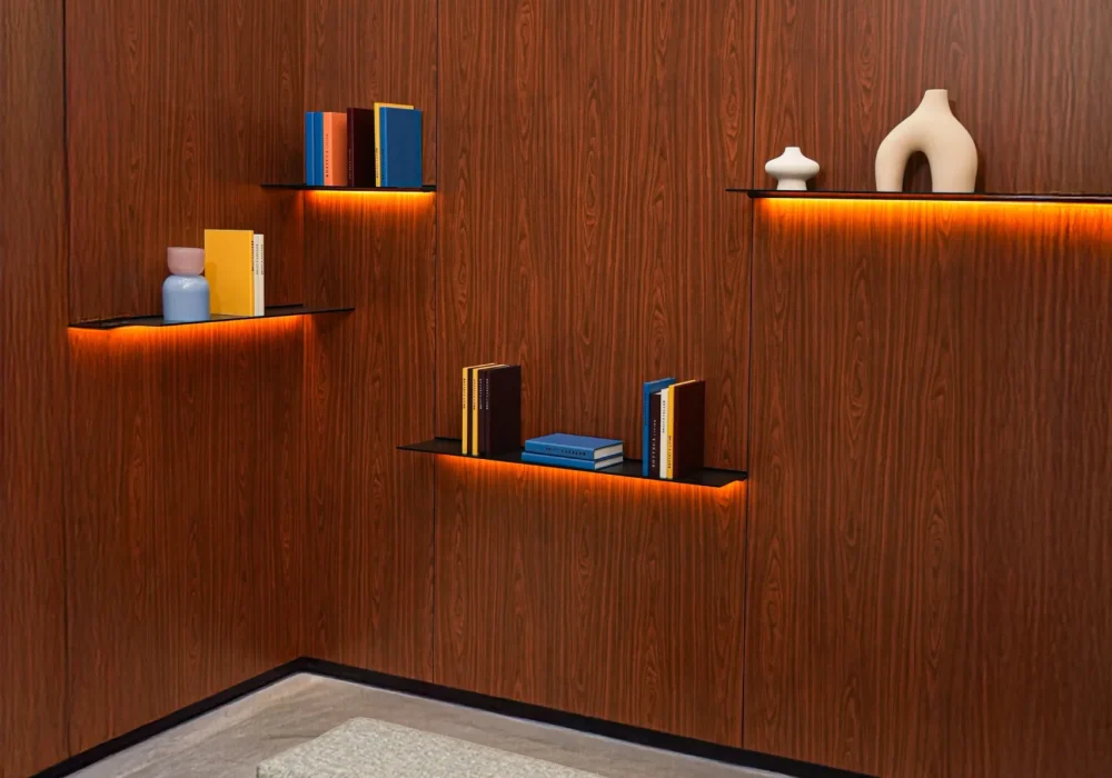 Finishing: Wood Texture HPL (Panel), Black Aluminum Shelves & Trim